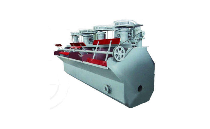 The flotation machine is suitable for the choice of non-ferrous metal, and can be used in non-metal, such as coal and stone. The flotation machine by the motor to drive triangle impeller rotates, centrifugal effect to form the negative pressure, on the one hand, plenty of air inhaled mixed with pulp, on the one hand, mixing slurry mixed with drugs, refining the bubble at the same time, make the mineral adhesive foam, float to the pulp surface to form the mineralized froth. Adjust the height of the gate and control the surface of the liquid, so that a useful foam can be scraped off. Principle: the pulp and medicament intensive mixing into the flotation machine after the first chamber under the trough, the impeller rotation, form a negative pressure in the cavity, the wheels make the pulp in the tank and tank under respectively by the impeller under the suction on the suction and into the mixed zone, air along the guide sleeve into the mixing zone, pulp, air and medicament mix: Under the effect of impeller centrifugal force, after mixing the slurry into the mineralization zone, air bubble and shattered and good contact with particles, formation of mineralized bubbles, under the action of the stator and the turbulent flow plate, evenly distributed in the tub section, move up into the separation zone, enrichment of foam layer formation, by blowing bubble discharge, fine powder foam. The unmineralized particles in the bottom of the tank are mixed, mineralized and separated once again through the circulation hole and the upper suction. Tank bottom is not part of the impeller suction pulp, pulp through the box into the second chamber of middlings was under the tank, after complete the whole process of the second chamber, into the third chamber, flotation machine so the cycle, pulp through after the last chamber into the discharge final tailings tailings box.